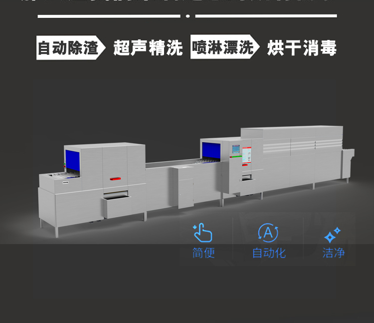 上超商用全自動超聲波洗碗機用于中、大型食堂清洗各類餐具等,由噴淋除渣預洗段、超聲清洗段、噴淋漂洗段(含清水噴淋漂洗)、烘干消毒段四段及餐具定位傳送網帶、控制系統、安全防護系統等部分及主體框架構成。核心技術為超聲乳化油脂,僅需少量普通洗潔精或食用堿,無需專用洗滌劑,即可達到良好的清洗效果。
